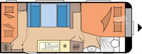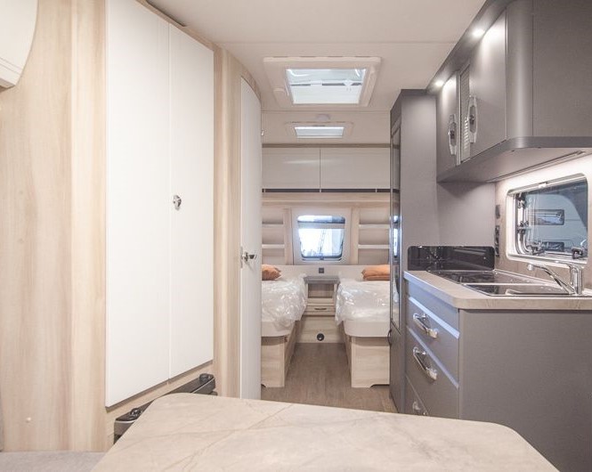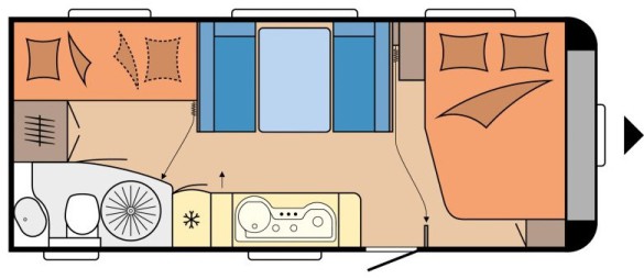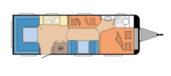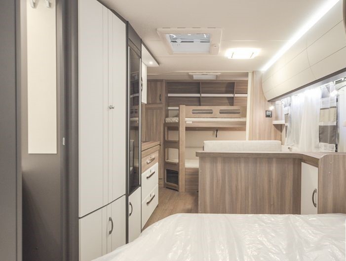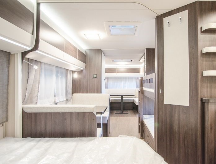 Tipologia Interna Dinette centrale convertibile in letto (caravan), letto matrimoniale fisso (caravan), letto a castello singoli posteriori trasversali