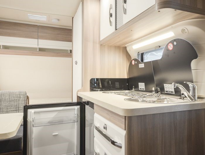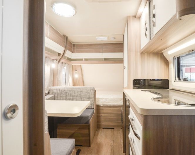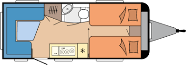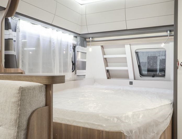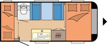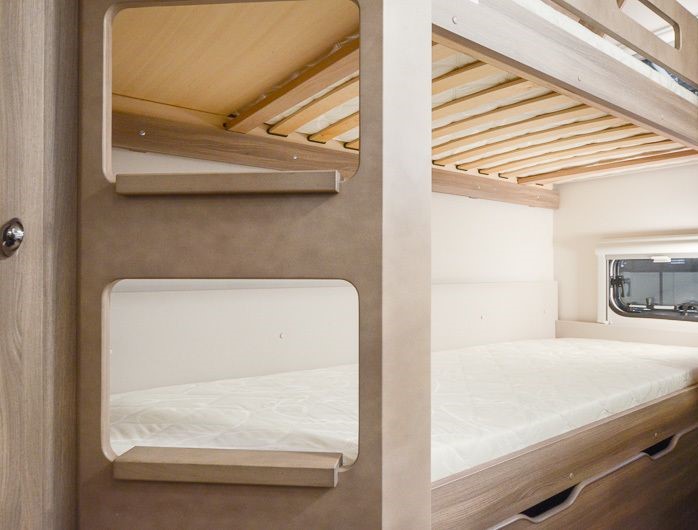 Tipologia Dinette centrale convertibile in letto (caravan), letti a castello singoli posteriori trasversali , letto matrimoniale francese