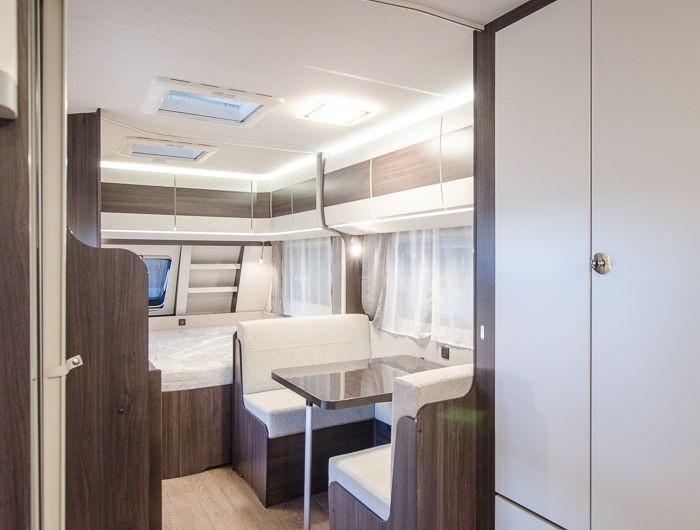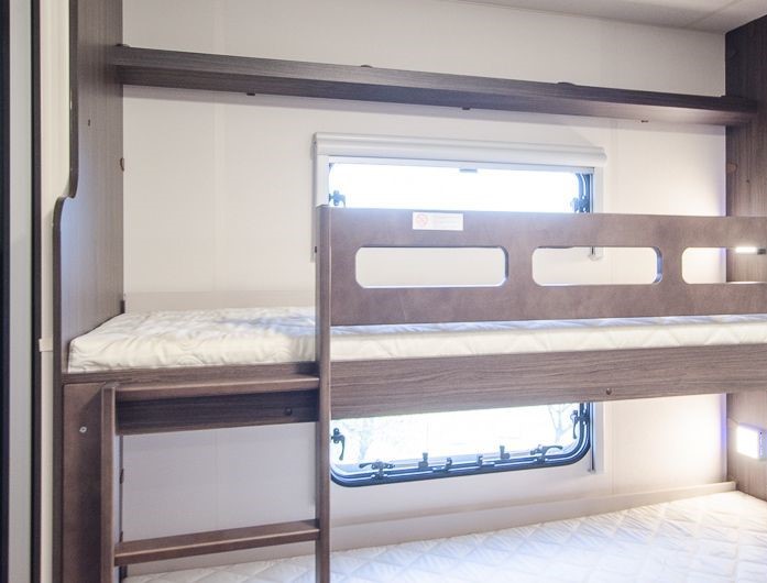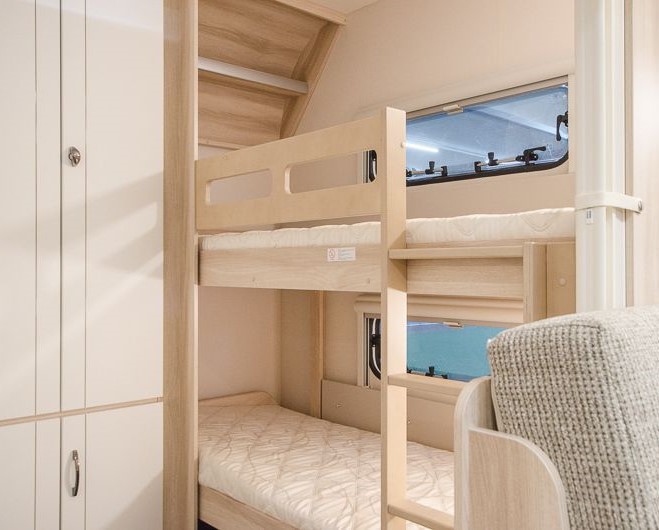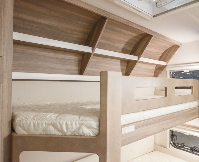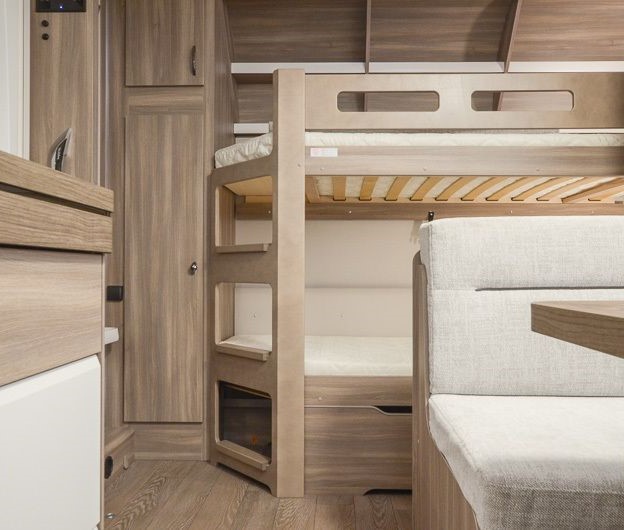 Tipologia Dinette centrale (caravan), letti a castello singoli laterali, letto matrimoniale francese trasversale.