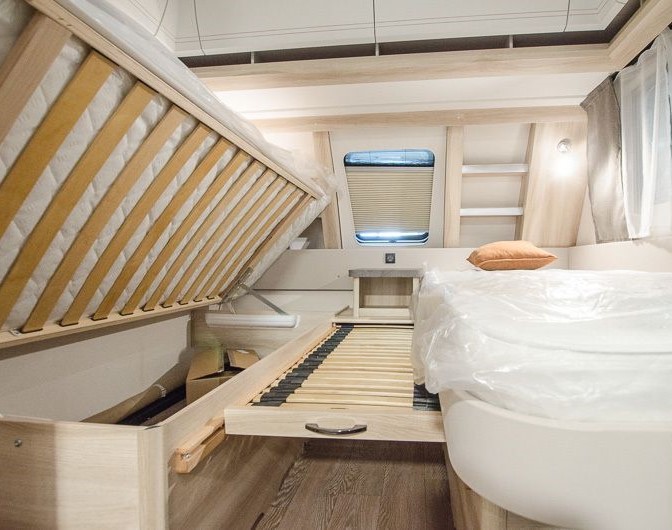 Tipologia Dinette a "U" convertibile a letto, dinette "face to face" convertibile in letto (caravan), letto matrimoniale francese, letti a castello singoli laterali